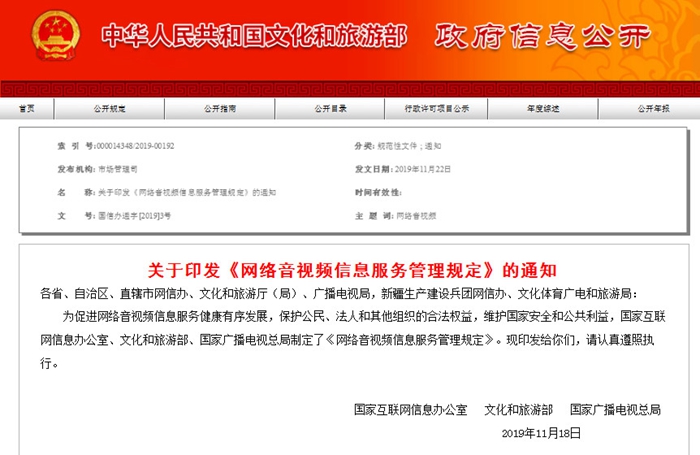 三部门联合印发《网络音视频信息服务管理规定》