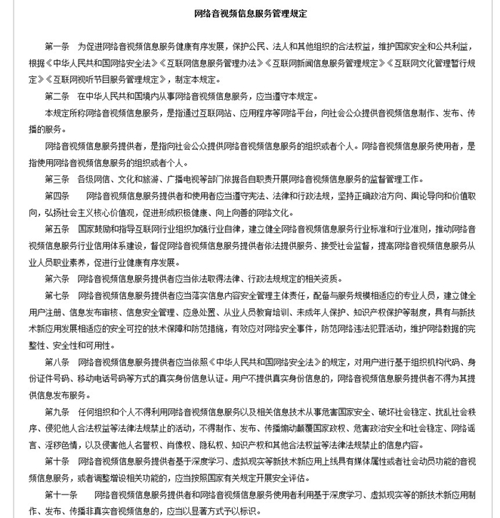 为促进网络音视频信息服务健康有序发展,保护公民、法人和其他组织的合法权益,维护国家安全和公共利益,近日,国家互联网信息办公室、文化和旅游部、国家广播电视总局联合印发了《网络音视频信息服务管理规定》。