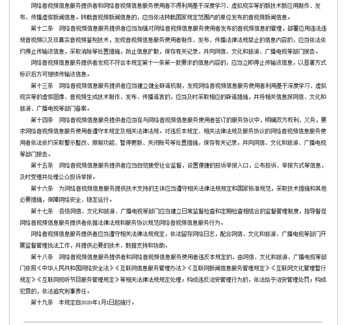 《规定》强调,网络音视频信息服务提供者和使用者应当遵守宪法、法律和行政法规,坚持正确政治方向、舆论导向和价值取向,弘扬社会主义核心价值观,促进形成积极健康、向上向善的网络文化;国家鼓励和指导互联网行业组织加强行业自律,建立健全网络音视频信息服务行业标准和行业准则,推动网络音视频信息服务行业信用体系建设,督促网络音视频信息服务提供者依法提供服务、接受社会监督,提高网络音视频信息服务从业人员职业素养,促进行业健康有序发展;网络音视频信息服务提供者和网络音视频信息服务使用者利用基于深度学习、虚拟现实等的新技术新应用制作、发布、传播非真实音视频信息的,应当以显著方式予以标识,不得利用基于深度学习、虚拟现实等的新技术新应用制作、发布、传播虚假新闻信息;网络音视频信息服务提供者应当建立健全辟谣机制,发现网络音视频信息服务使用者利用基于深度学习、虚拟现实等的虚假图像、音视频生成技术制作、发布、传播谣言的,应当及时采取相应的辟谣措施,并将相关信息报网信、文化和旅游、广播电视等部门备案。