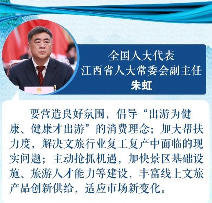 “旅游业是‘一业兴、百业兴’的朝阳产业,前景一片光明。”全国人大代表、江西省人大常委会副主任朱虹表示,江西统筹推进疫情防控和经济社会发展工作,着力营造良好旅游消费环境,出台了打好“组合拳”提振旅游消费、进一步激发文化和旅游消费潜力的实施意见等政策措施,引导广大市民、游客健康放心出游。五一假期,市场稳步复苏、热而有序,显示出常态化疫情防控下江西旅游向好的态势。要营造良好氛围,倡导“出游为健康、健康才出游”的消费理念;加大帮扶力度,解决文旅行业复工复产中面临的现实问题;主动抢抓机遇,加快景区基础设施、旅游人才能力等建设,丰富线上文旅产品创新供给,适应市场新变化。