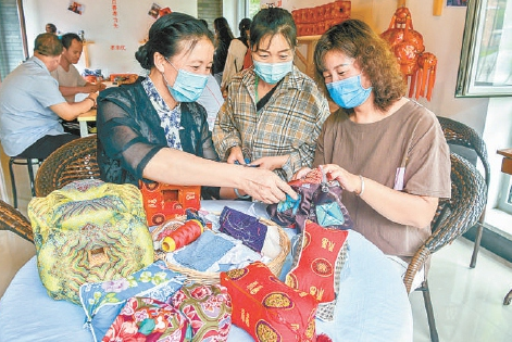 在云蒙山风景区内的非遗体验区,朱会萍(右三)指导村民缝制玲珑枕。 邓伟摄