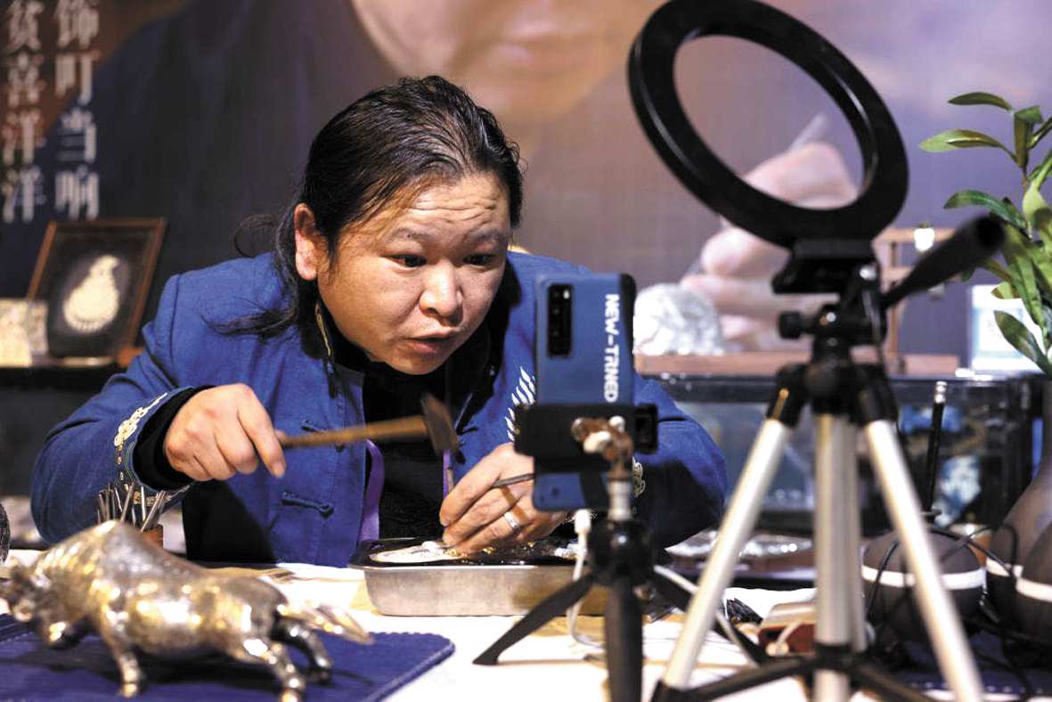 来自贵州的潘仕学直播锻造苗族银饰 郭绪雷摄