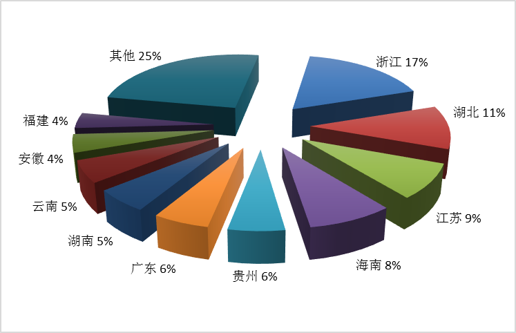 2020年度旅行社国内旅游接待人次排名前十位的地区由高到低依次为浙江、湖北、江苏、海南、贵州、广东、湖南、云南、安徽、福建。