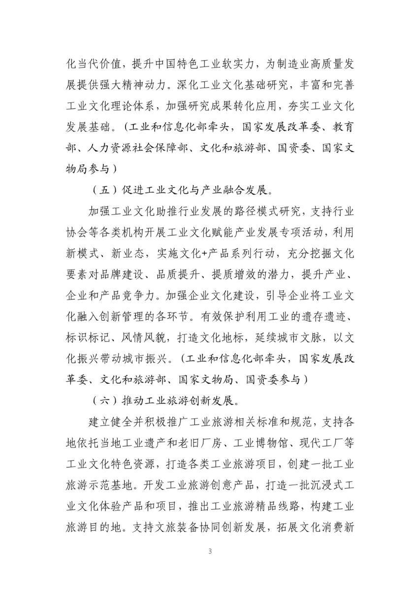 工业和信息化部、国家发展和改革委员会、教育部、财政部、人力资源和社会保障部、文化和旅游部、国务院国有资产监督管理委员会、国家文物局近日联合印发《推进工业文化发展实施方案(2021-2025年)》,提出通过五年努力,工业文化支撑体系基本完善,理论研究与应用实践进一步深入,工业文化新载体更为丰富,初步形成分级分类的工业遗产保护利用体系和分行业分区域的工业博物馆体系;打造一批具有工业文化特色的旅游示范基地和精品路线,建立一批工业文化教育实践基地,传承弘扬工业精神;推动工业文化在服务全民爱国主义教育,满足并引领人民群众文化需要,增强人民精神力量等方面发挥积极作用,推动形成工业文化繁荣发展的新局面。