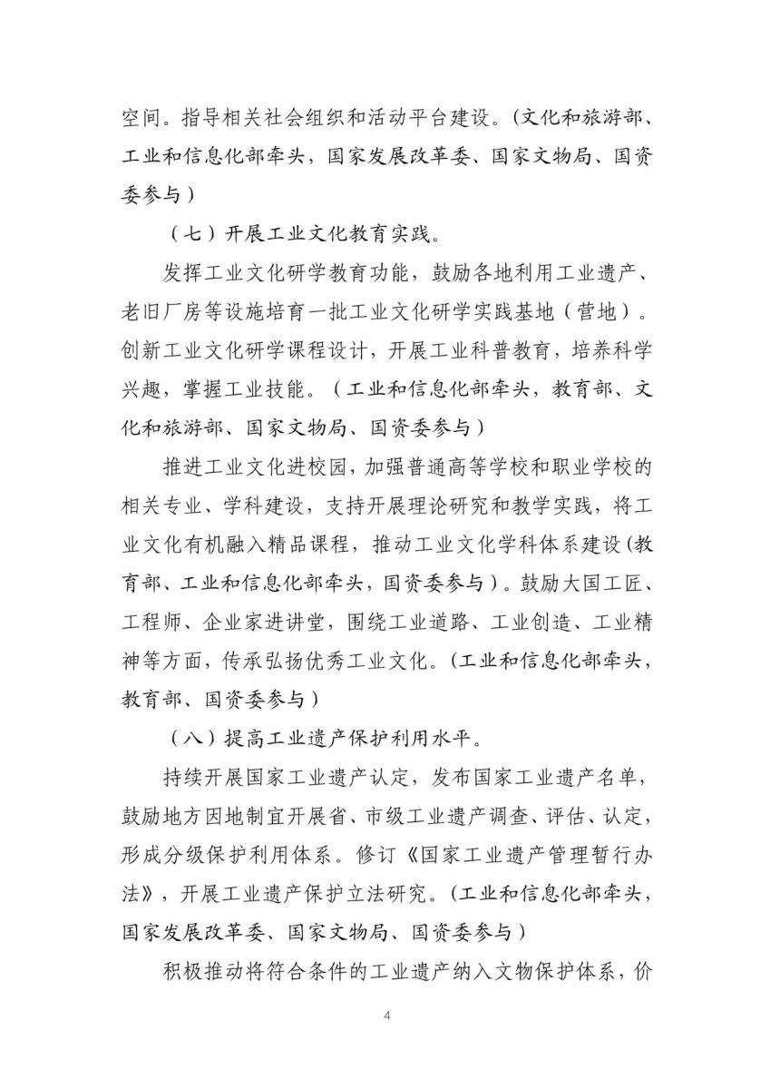 四是加强工业遗产保护利用。以国家工业遗产认定为主的工业遗产保护利用工作已成为推进工业文化发展的重要抓手,在社会上引起广泛关注。《实施方案》推动建立分级保护利用体系,制定保护准则和指南,修订《国家工业遗产管理暂行办法》,促进保护与修复关键技术研发应用。