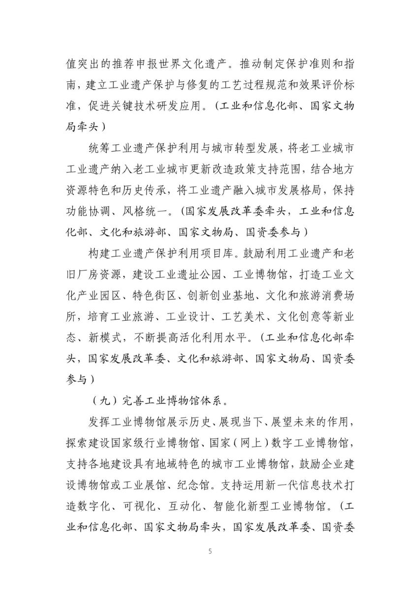 构建工业遗产保护利用项目库。鼓励利用工业遗产和老旧厂房资源,建设工业遗址公园、工业博物馆,打造工业文化产业园区、特色街区、创新创业基地、文化和旅游消费场所,培育工业旅游、工业设计、工艺美术、文化创意等新业态、新模式,不断提高活化利用水平。