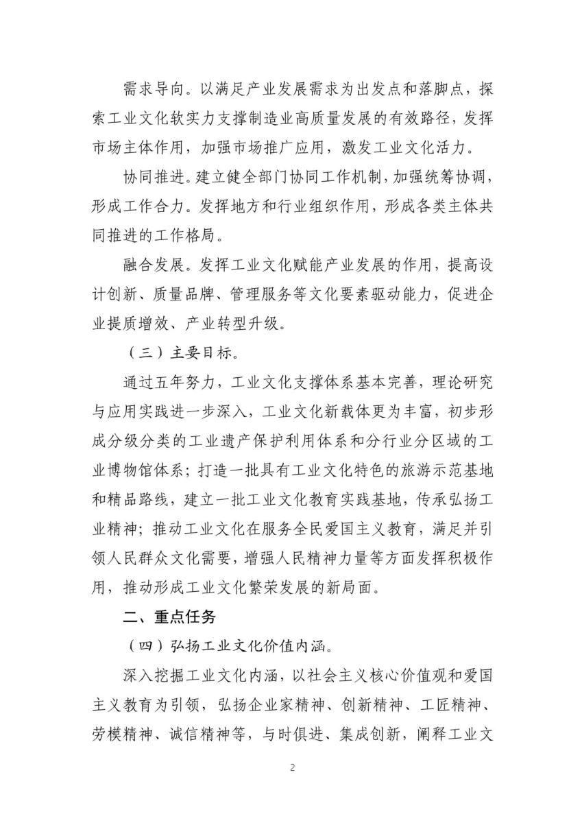 第一部分“总体要求”,提出推进工业文化发展的指导思想、基本原则和主要目标,强调坚持“政策引领、需求导向、协同推进、融合发展”。