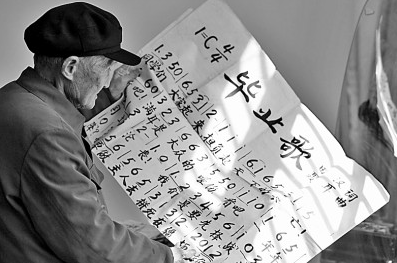 安徽定远县朱湾小学音乐教室里,92岁的退休教师严明友在整理自己手抄的红色歌曲歌谱。新华社发