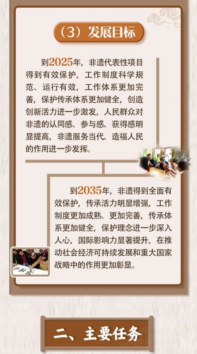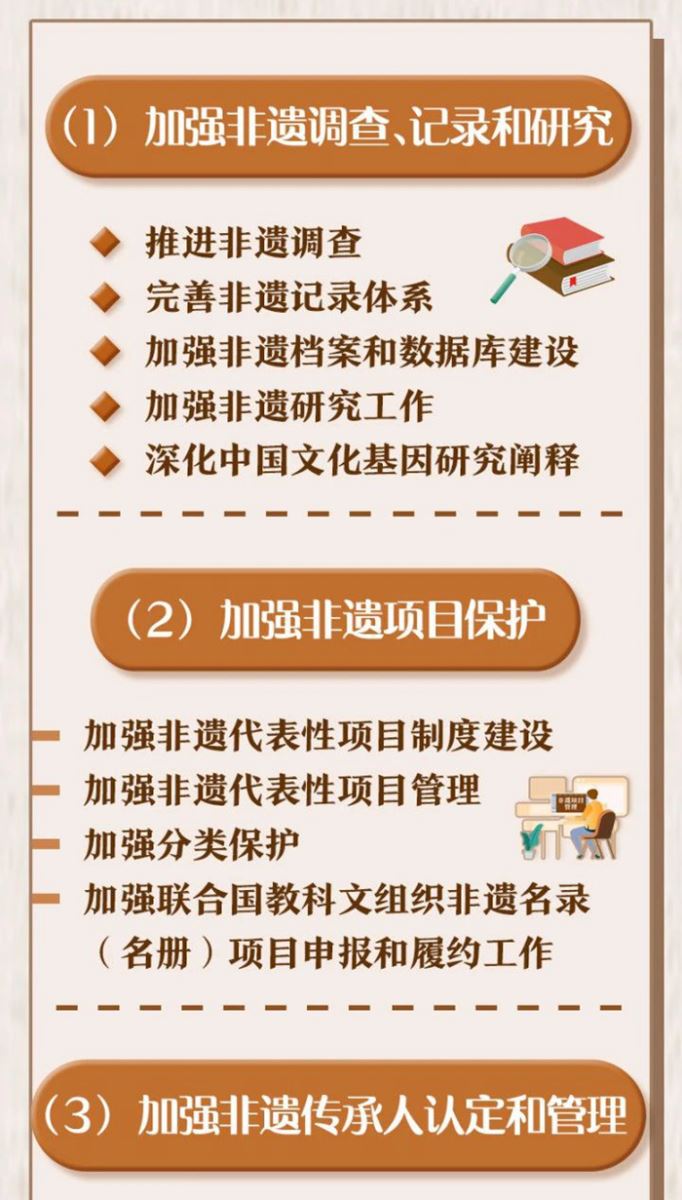 《规划》明确了加强非遗调查、记录和研究,加强非遗项目保护,加强非遗传承人认定和管理,加强非遗区域性整体保护,加大非遗传播普及力度和服务社会经济发展6个方面主要任务,并通过8个专栏对传统工艺高质量发展、文化生态保护区建设等重点工作进行了部署。