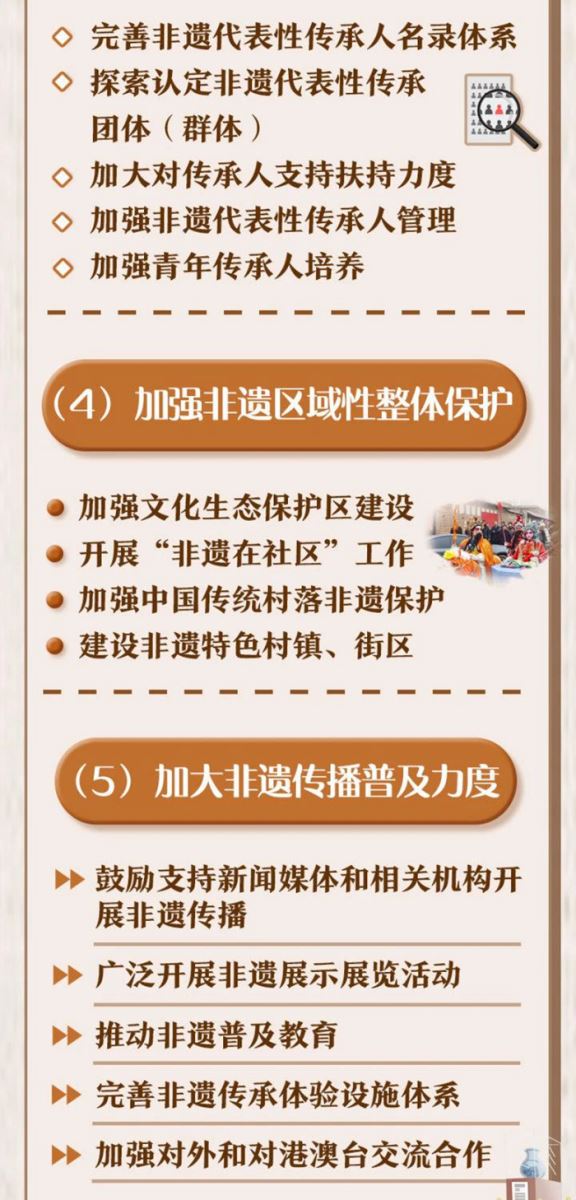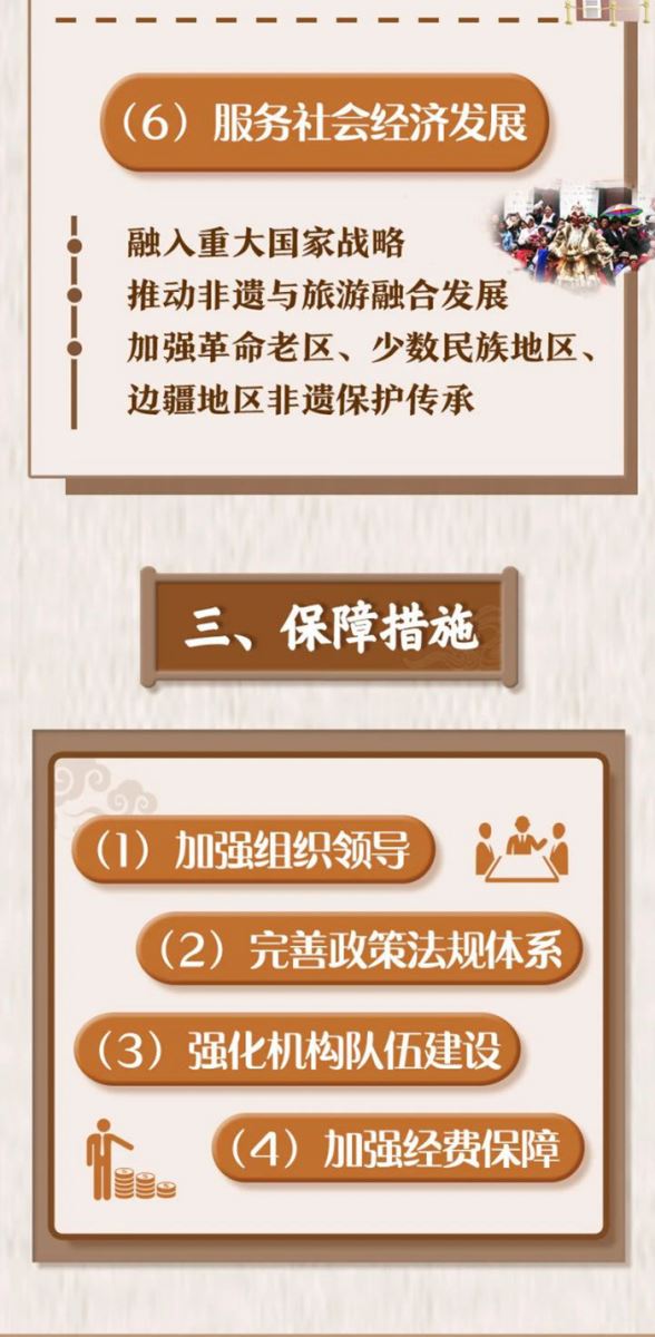 《规划》从加强组织领导、完善政策法规体系、强化机构队伍建设、加强经费保障4个方面保障各项措施的落实,推动形成有利于非遗保护传承的体制机制和社会环境。