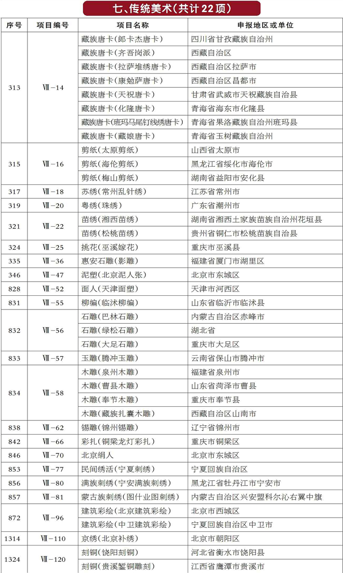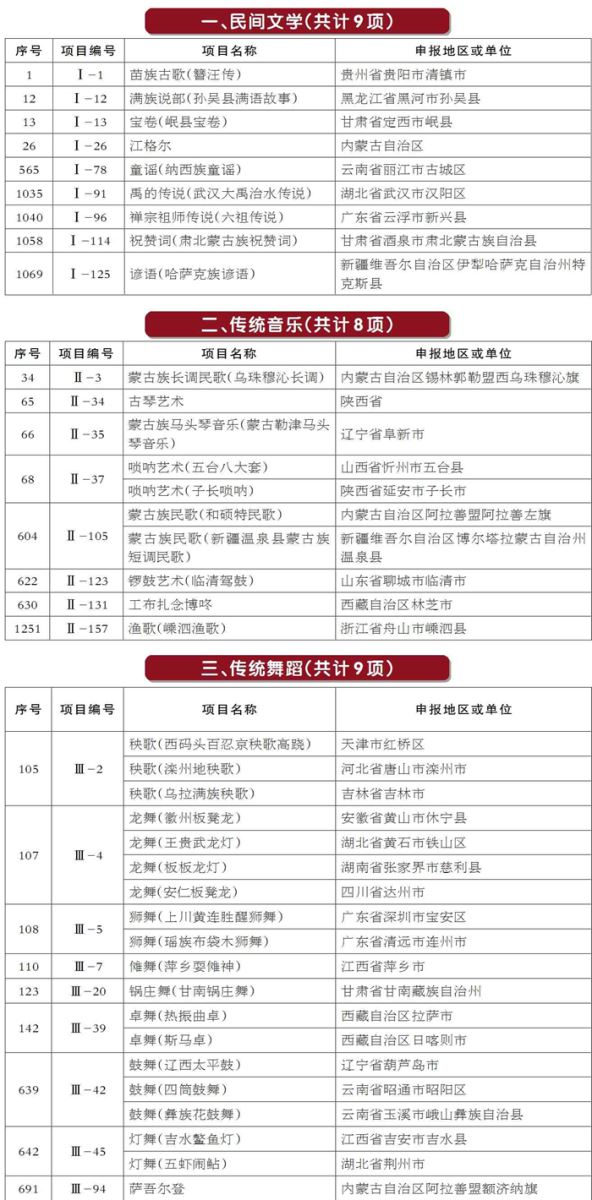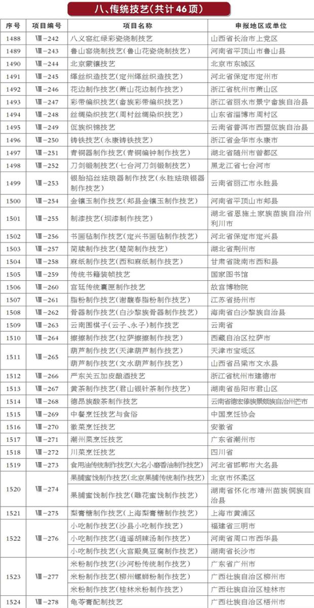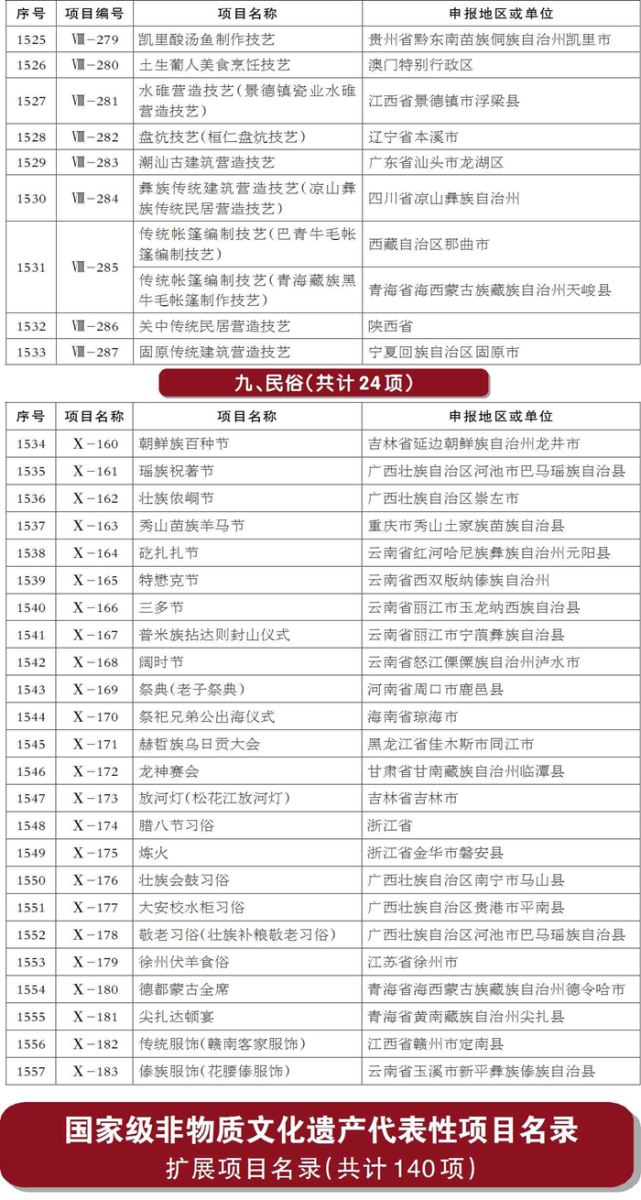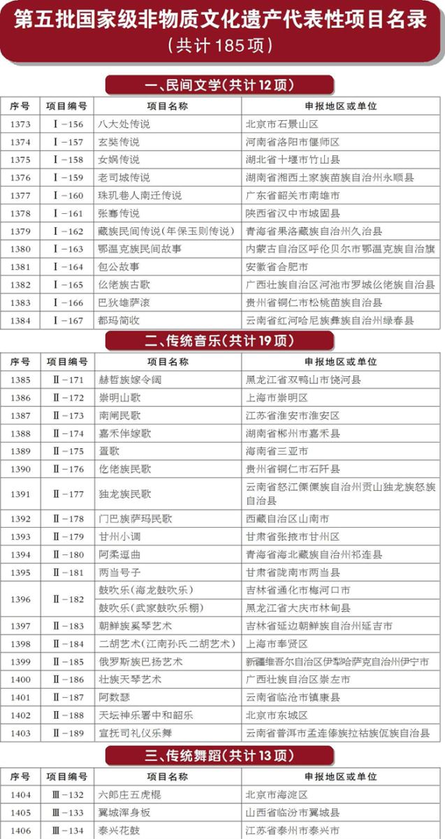 国务院批准文化和旅游部确定的第五批国家级非物质文化遗产代表性项目名录(共计185项)和国家级非物质文化遗产代表性项目名录扩展项目名录(共计140项),现予公布。