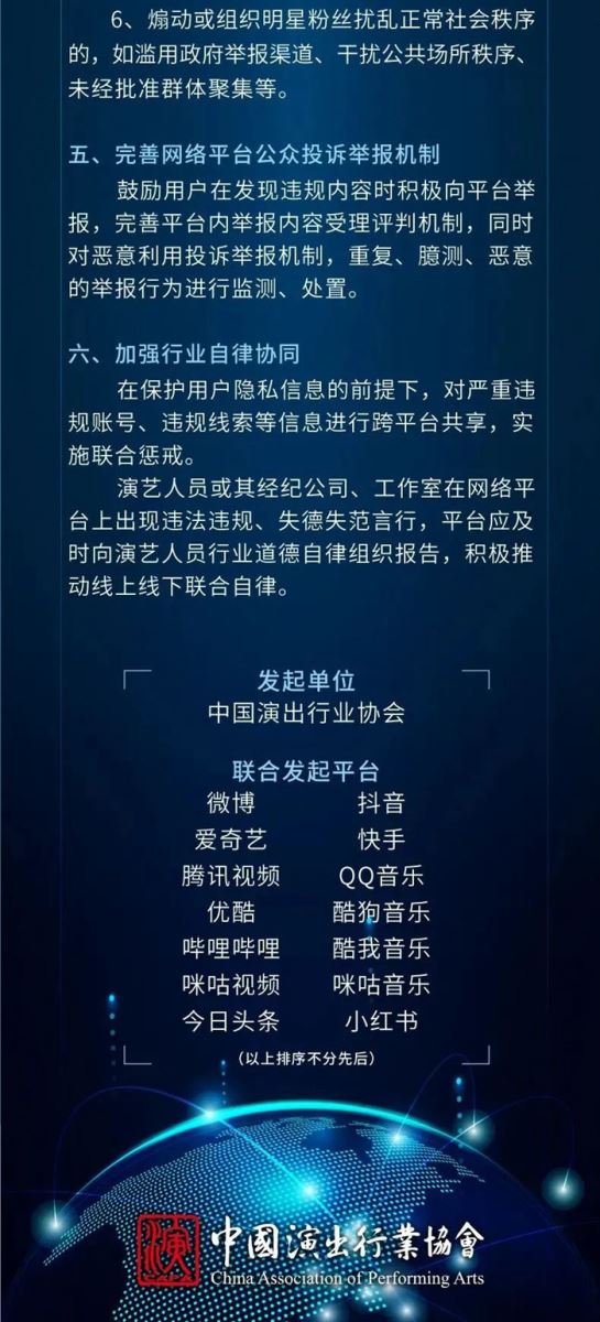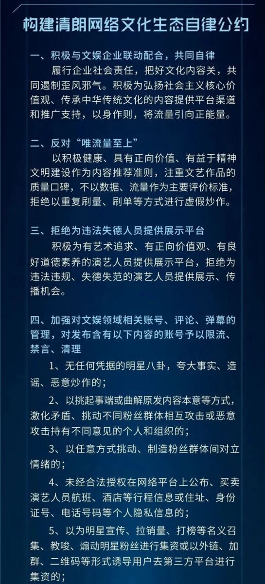 根据公约,各平台将积极与文娱企业联动配合,共同自律,履行企业社会责任,把好文化内容关,共同遏制歪风邪气,积极为弘扬社会主义核心价值观、传承中华优秀传统文化的内容提供平台渠道和推广支持,以身作则,将流量引向正能量;反对“唯流量至上”,以积极健康、具有正向价值、有益于精神文明建设作为内容推荐准则,注重文艺作品的质量口碑,不以数据、流量作为主要评价标准,拒绝以重复刷量、刷单等方式进行虚假炒作;拒绝为违法失德人员提供展示平台;加强对文娱领域相关账号、评论、弹幕的管理;完善网络平台公众投诉举报机制;加强行业自律协同,在保护用户隐私信息的前提下,对严重违规账号、违规线索等信息进行跨平台共享,实施联合惩戒,演艺人员或其经纪公司、工作室在网络平台上出现违法违规、失德失范言行,平台应及时向演艺人员行业道德自律组织报告,积极推动线上、线下联合自律。