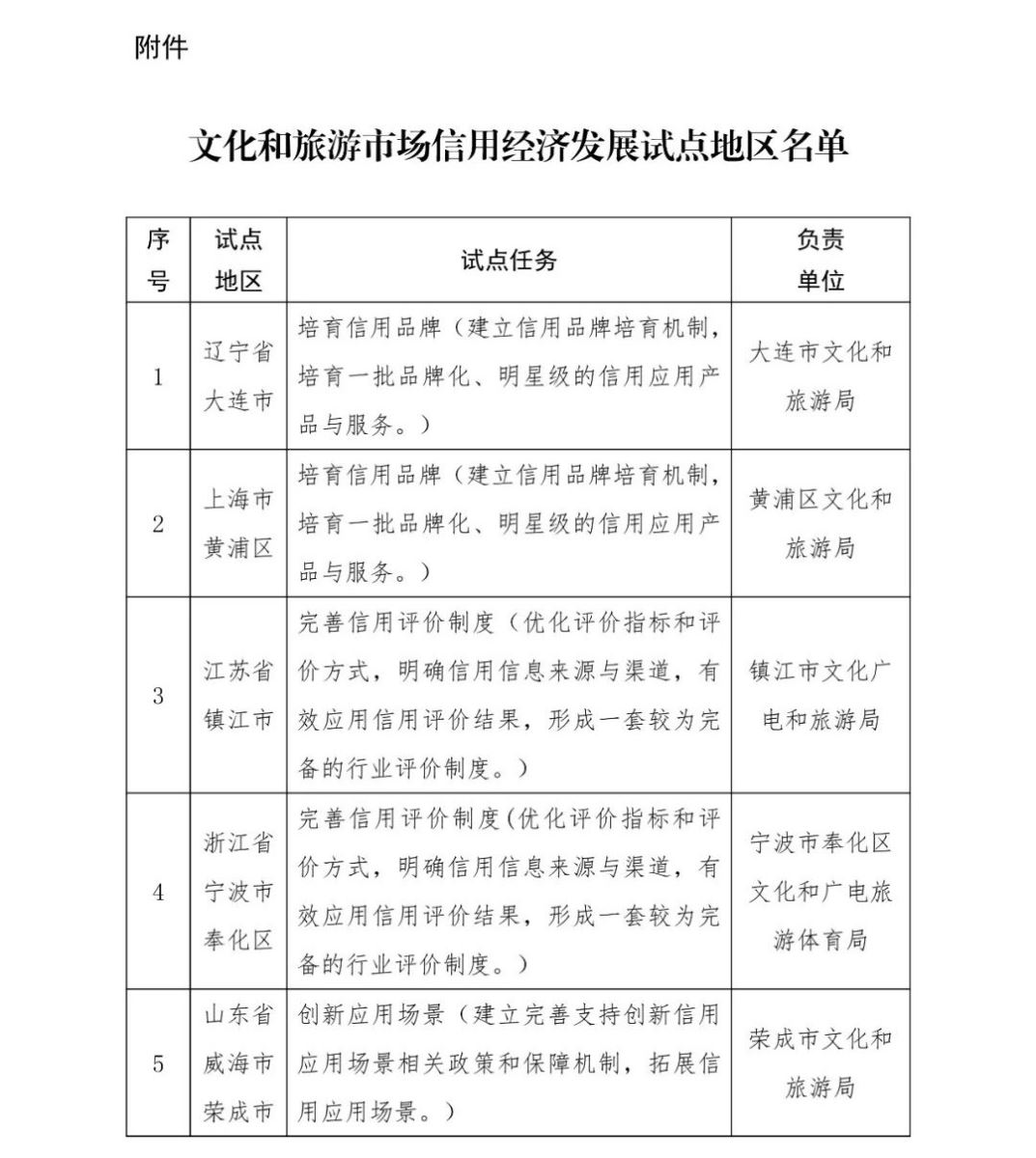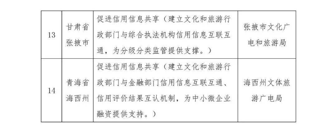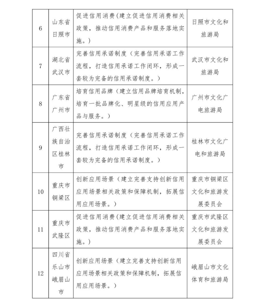 为贯彻落实党中央、国务院关于健全社会信用体系的决策部署,按照《国务院办公厅关于加快推进社会信用体系建设构建以信用为基础的新型监管机制的指导意见》(国办发〔2019〕35号)关于“组织开展信用建设和信用监管试点示范”、《“十四五”文化和旅游发展规划》关于“拓展信用应用场景”、《“十四五”文化和旅游市场发展规划》关于“探索开展信用经济发展试点工作”等要求,文化和旅游部启动了文化和旅游市场信用经济发展试点工作。经地方申报、省厅推荐、专家评审、台账校验、调研复核等程序,现确定辽宁省大连市等14个地区为文化和旅游市场信用经济发展试点地区(见附件)。