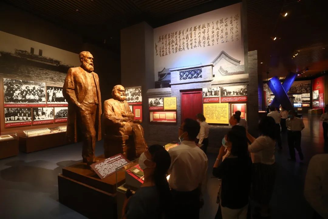 观众在中国共产党历史展览馆参观,展览中大量经典美术作品吸引观众驻足观看,图为吴为山创作的马克思恩格斯雕像与大量文献共同展出。