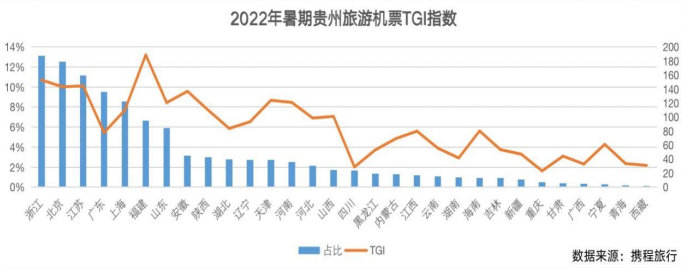 (备注:TGI=[目标群体中具有某一特征的群体所占比例/总体中具有相同特征的群体所占比例]*标准数100,例如:浙江客源旅客贵州游TGI=浙江客源中贵州游出行人次占浙江客源境内出行总人次比例/所有境内客源旅客中贵州游出行人次占境内客源出行总人次比例*100。TGI大于100,代表着某类群体更具有相应的倾向或者偏好,数值越大则倾向和偏好越强)