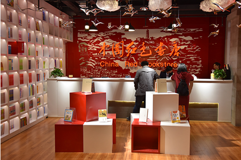 “红色图书区”展示红色经典读物和人文社科类畅销读物,以红色为主色调的党员工具书和伟人传记专柜显示出了红色书店的主题。