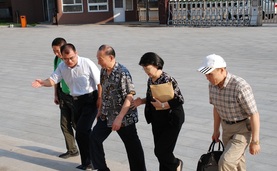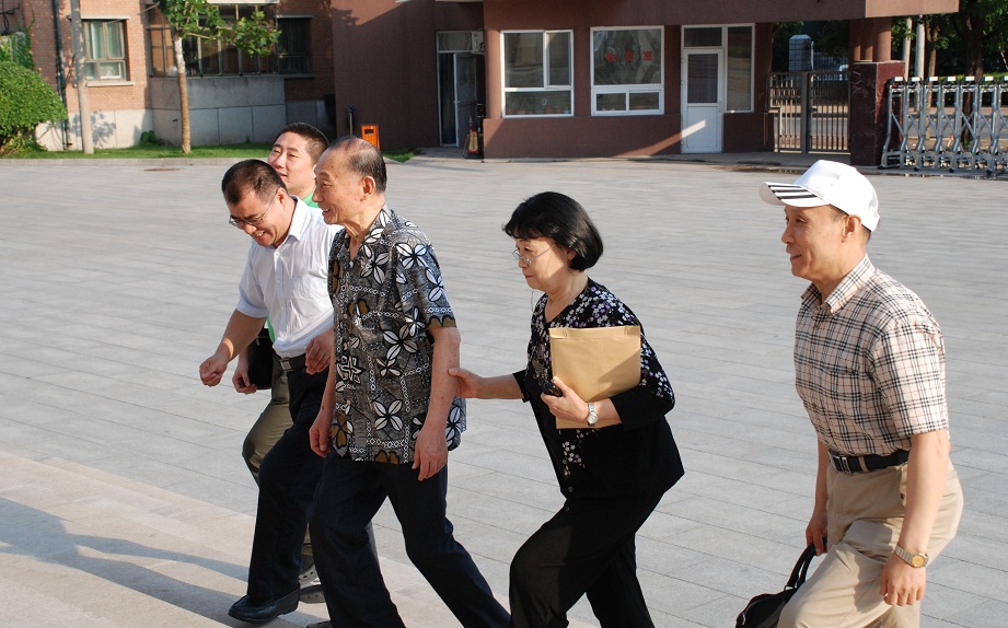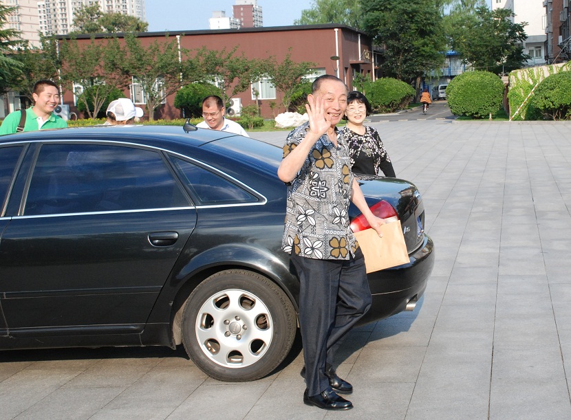 图三:中央文化管理干部学院党委副书记兼艺术学院院长景小勇在教学楼前迎接梅葆玖先生一行