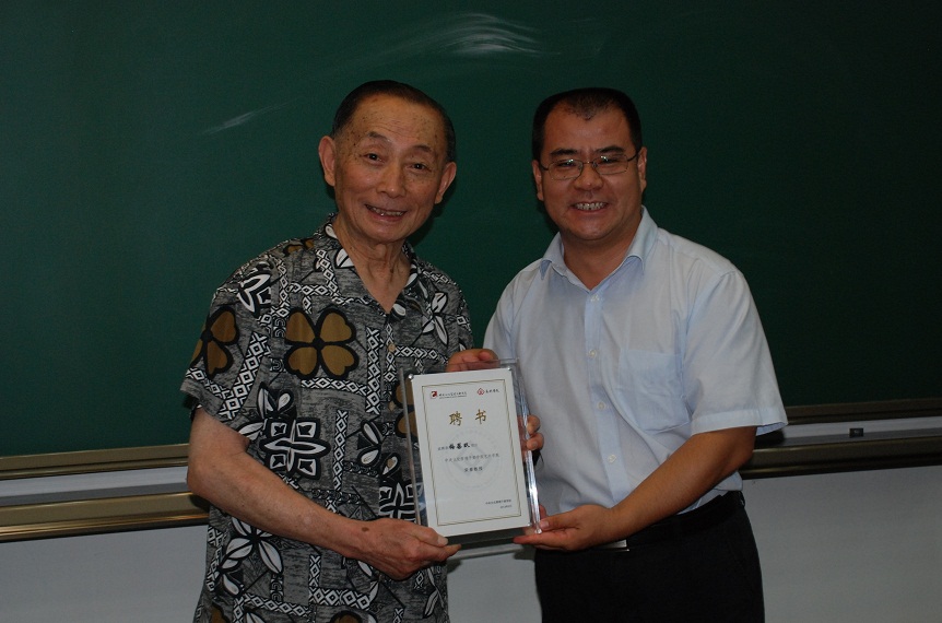 图六:中央文化管理干部学院党委副书记兼艺术学院院长景小勇为梅葆玖先生颁发荣誉教授聘书