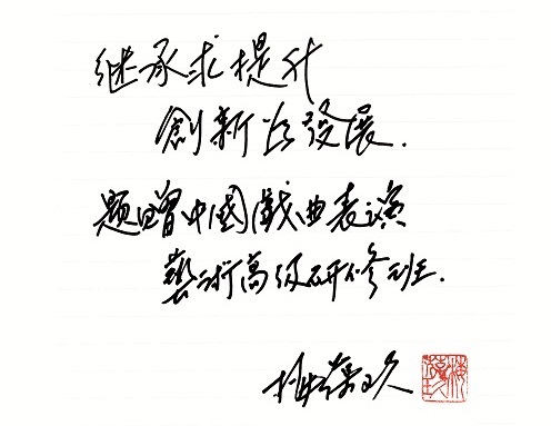 图九:梅葆玖先生为中国戏曲表演艺术高级研修班所作“继承求提升,创新为发展”题词