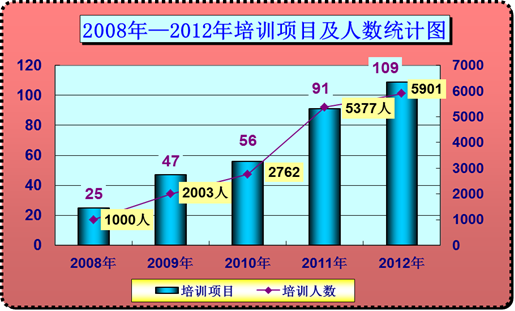 2012年,学院培训数量与规模稳步提升。完成培训项目107个,培训学员5901人次。