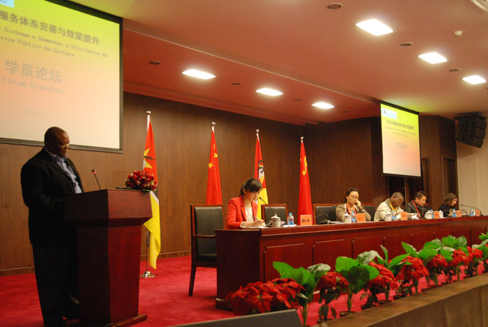 围绕公共文化服务专题,莫桑比克国家图书馆馆长菲力克斯(Roque Felix)、莫桑比克文化部国家文化遗产司主任伊万里斯多(Marcos Evaristo)、黑龙江省图书馆副馆长毕洪秋、陕西省汉中市略阳县文化旅游局局长张明等四位学员代表先后作了主题演讲,分别介绍了本国图书馆、博物馆的历史与发展,面临的机遇与挑战,与广大学员分享了中莫两国在开展图书馆、博物馆公共文化服务方面的经验和好的做法,就公共文化服务设施的公益性、效能性等内容进行了深入探讨。论坛活动气氛热烈,掌声不断,毕洪秋同志一句“天下图书馆人、博物馆人都是一家人”道出了在场所有学员的心声。