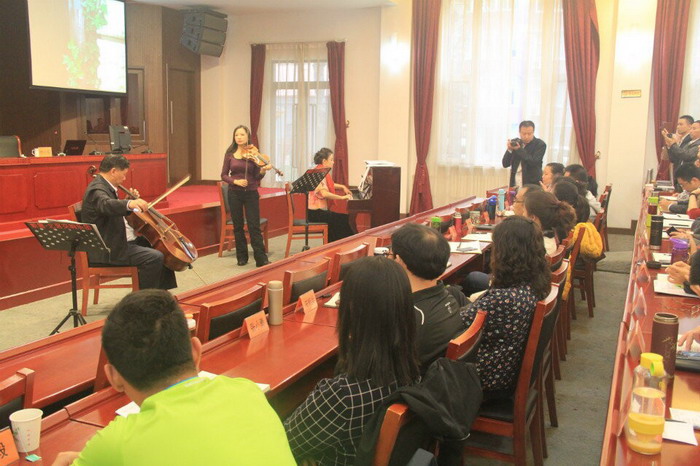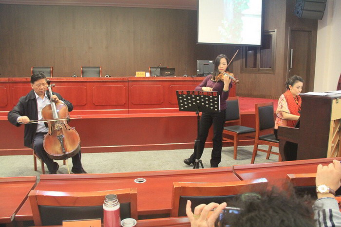 叶老师先与钢琴、小提琴演奏家一起为我们演奏了中外名曲《梁祝》、《鸿雁》、《菊花台》、《丽江恋》和《我唯一的祈求》。一曲曲经典优雅的音乐,瞬间就把我们带入了艺术的殿堂。叶老师的讲课方式轻松活泼,幽默风趣。时常出其不意,引人入胜。大家都集中思想,全神贯注,认真倾听,生怕错过了他半句话语。课堂上掌声笑声不断,气氛十分活跃。“乐以和其声”出自《礼记.乐记》。叶老师说,古人就知道这样的道理:有好的音乐,群众就会归化于仁义道德,礼乐相辅相成,社会就和睦安宁。叶老师把这句话作为他的音乐心得,向我们分享了他和音乐的情缘。他把音乐和处世结合起来,把音乐和生活结合起来,用自己体验和体会,向我们讲述了他对音乐的热爱,对音乐的理解,对音乐的追求。他推崇经典音乐,致力于经典音乐的传播和推广,普及交响乐。他打破世俗,在看似不可能的年纪,勇敢地拿起了乐器,追求他的音乐梦想,通过自身的学习和练习,让音乐流淌在自己的指尖,同时形成了独到的音乐见解和个人理论。