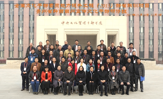 本次研修班由文化部人事司、贵州省黔西南州委宣传部和我院联合主办,培训项目被列为全国文化干部素质能力提升工程(2015)部省联训项目,属于文化部面向全国文化系统的重点项目,也是我院首次把地级市合作对象列入该项目。目的是通过学习,深入贯彻落实中央宣传思想工作会议精神,进一步提升黔西南州宣传文化干部在推动文化产业发展、处置重大舆情、推动媒体融合发展等方面的能力和水平。