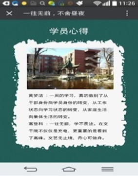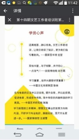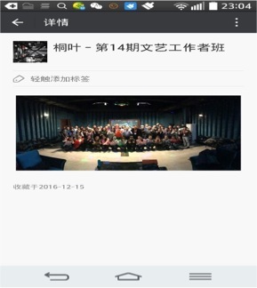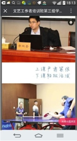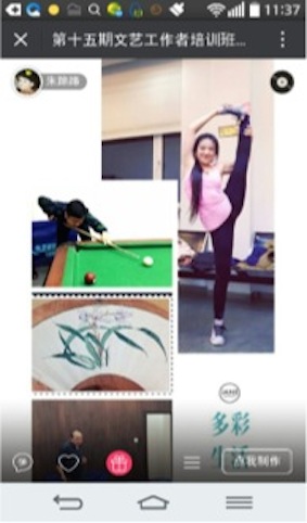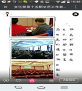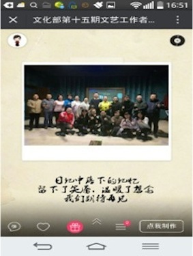这是2016年12月22日文化部第十五期文艺工作者培训班211人结业日十个组竞相发布手机版学习简报壮观场景之一中的一个碎片截图,由此可见学员学习风貌之一斑……他们记述了200多名学员的可歌可泣的学习感人场景,也形象真实客观地记录下他们开心快乐的"大学生"一般的青春再现时光,再现了"抗大"学风"团结紧张,严肃活泼"。