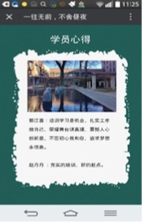 一期手机报,凝聚全组乃至全班人的心,展示团队形象,践行团队奋进口号和目标,是集体智慧、才艺编创、知识链接、亲情演绎、感人故事、教学相长、学学相长、学有所得、学以致用、培训历程、生活时光瞬间的美好记忆之集大成,形式图文并茂,学员喜闻乐见,并伴有音乐流淌,是学员们学习生活的一段刻骨铭心记忆。有些学员说,大学四年未必有此精彩,这真是一期同学、一生朋友的历史见证! ?