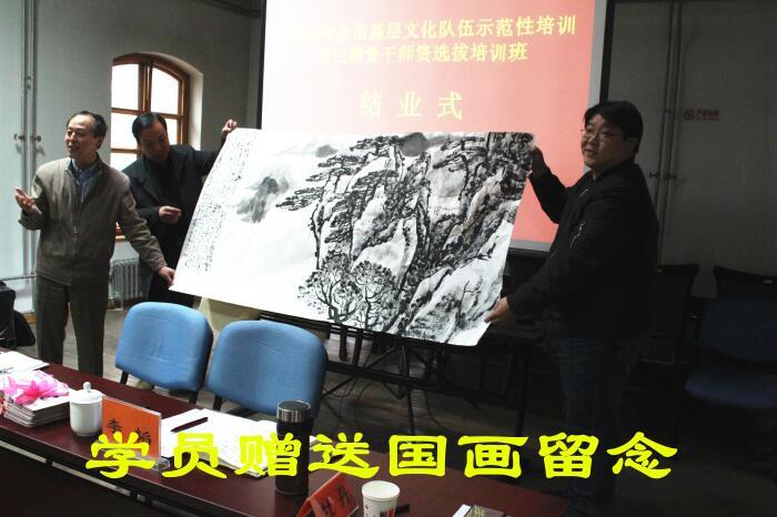 在结业式的尾声,班长肖贵中浓重介绍学员安徽省文化馆美术摄影部主任王永敬(国家一级美术师)亲自主笔挥毫佳作并写满全班同学姓名的一幅大型国画,赠送给“母校”文干院留念。