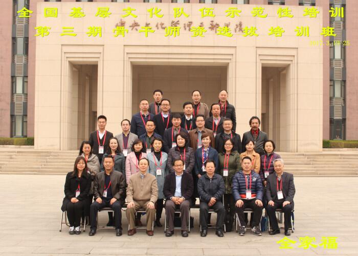 3月19日至25日,该班在我院举行,来自全国各省文化厅推荐的师资骨干共29人(每省1人)参加了培训。这也是2017年全国基层文化队伍示范性培训系列中的一个重要班次,受到了领导的高度重视。在开班式上,中央文化管理干部学院副院长段周武同志作了热情洋溢的开班动员,特别是,在培训期间,主办方文化部公共文化司群文指导处处长尹寿松带领两位工作人员亲临培训班,与班委组长和学员代表亲切座谈,征求学员对于培训安排和培训组织管理工作的意见和建议,勉励学员试讲要力争出特色、出水平。
