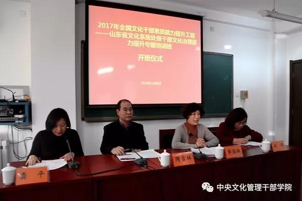 2018年1月8日至13日,我院与山东省文化厅共同举办了“2017年全国文化干部素质能力提升工程——山东省文化系统处级干部文化治理能力提升专题培训班”,来自山东省文化厅、厅直属单位、各地文广新局的35位处级干部参加了此次培训。山东省文化厅副厅长李国琳、我院副院长隋吉林出席开班仪式并讲话。