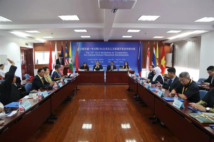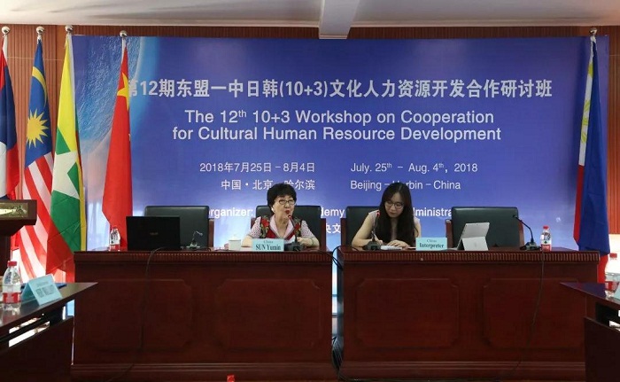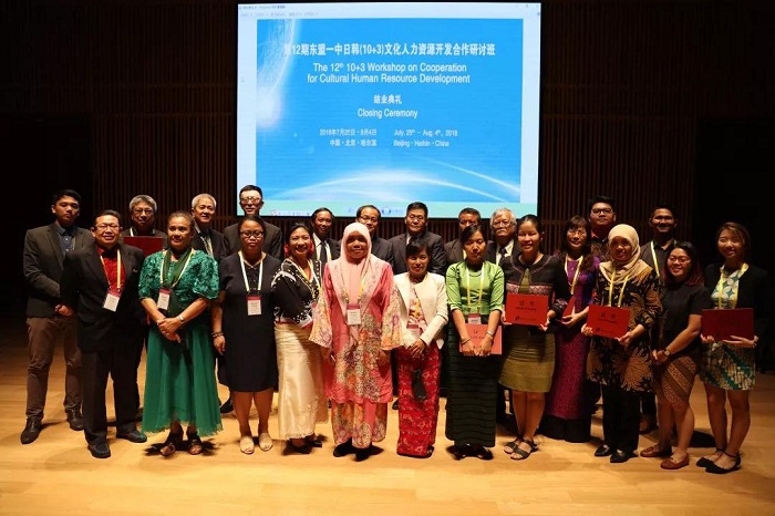 为促进10+3区域内文化多样性保护和发展取得更大进步,也为促进区域内文化领域务实合作以及构建人类命运共同体贡献10+3的力量,在国家财政部的支持和文化和旅游部的指导下,第12期东盟-中日韩(10+3)文化人力资源开发合作研讨班在北京、2018年“东亚文化之都”当选城市哈尔滨顺利举办。来自东盟秘书处、印度尼西亚、日本、老挝、马来西亚、缅甸、菲律宾、新加坡、泰国、文莱和越南的23位文化官员参加了本期研讨班。8月3日下午,结业典礼在哈尔滨市音乐厅举办,中央文化管理干部学院党委书记、副院长段周武,哈尔滨市人民政府副秘书长王宪民出席结业典礼,结业典礼由哈尔滨市文化广电新闻出版局局长勾庆杰主持。