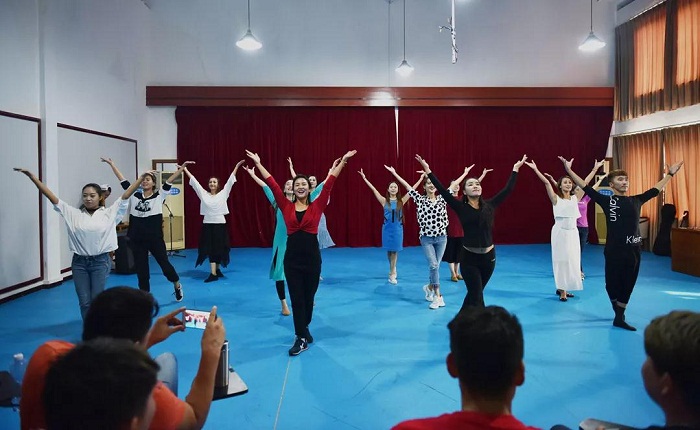 艺术实践上,引导学员们创排了哈萨克族舞蹈《黑走马》、《姐妹情》,维吾尔族舞蹈《女人花》,柯尔克孜族舞蹈《家乡·我的美》,蒙古族舞蹈《贝勒格》等展现民族特色的文艺作品。