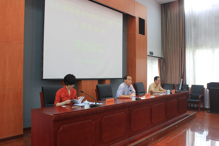 2013年6月26日至7月5日,全国文化人才素质能力提升工程文化强国建设与地区文化竞争力专题研修班在我院举行,这也是全国文化人才素质能力提升工程系列中的第二个培训班,受到了领导的高度重视。在开班典礼上,中央文化管理干部学院副院长段周武致欢迎辞,欢迎从全国各地远道而来的学员,文化部人事司培训处处长杨仲怡作开班讲话,中央文化管理干部学院培训部主任刘瑞彪主持。