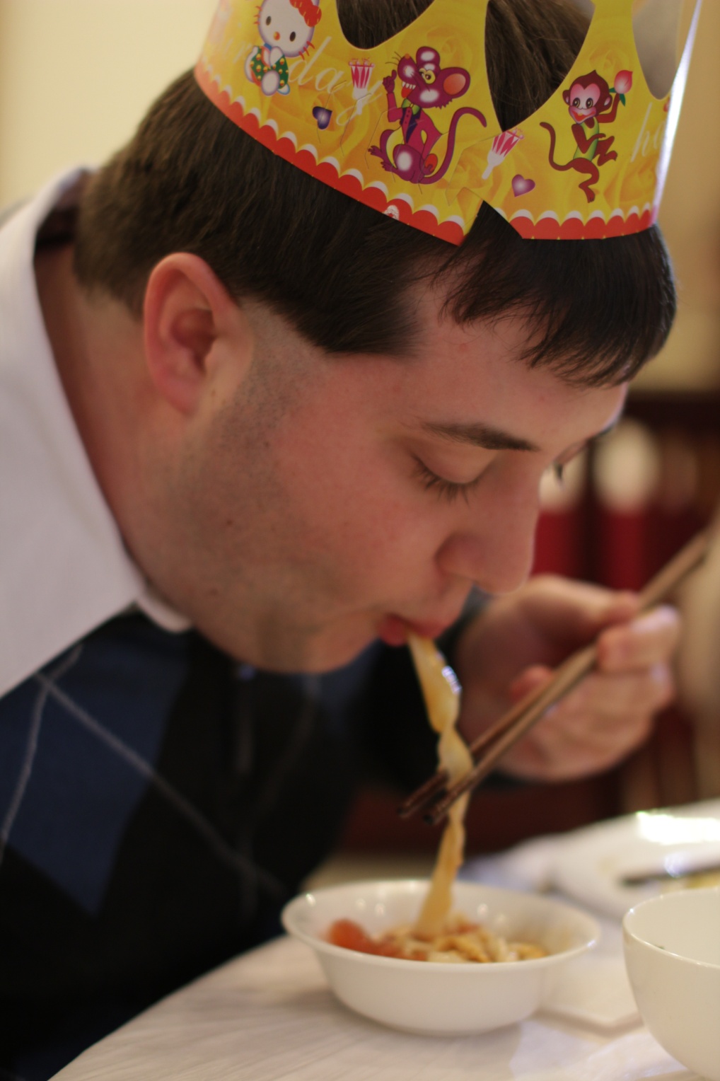 John Bayard是一位酷爱中国文化的美国男孩,业余二胡演奏家,正在学习中文,美国瓦尔普莱索大学法律及艺术管理双硕士在读研究生,研修班举办期间恰逢27岁生日。他高兴地分享生日蛋糕,吃长寿面。