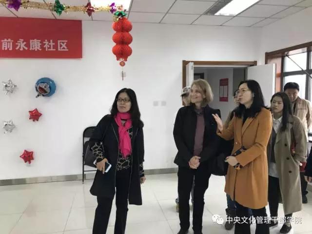 贝蒂教授在学院访问期间,科研处同志陪同贝蒂女士一行实地走访调研了东城区部分街道和社区文化活动情况。调研组一行先后走访了东城区安定门街道文体活动中心和社区文化室、北新桥街道前永康社区和东华门街道社区联合文化室,考察了公共文化设施运营情况,并听取了有关负责人对公共文化设施专业化和社会化运营的情况介绍。贝蒂教授表示,中国采取的由政府买单,社会力量参与,免费为社区居民提供公共文化服务这一举措很有成效,老百姓很受益。
