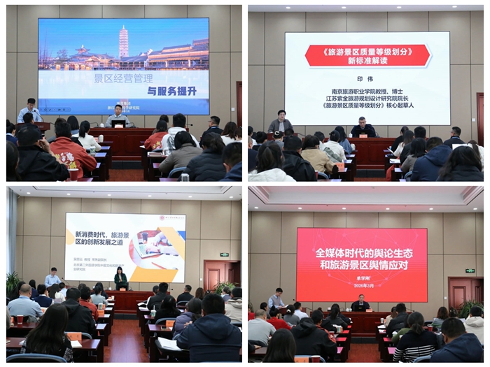 本次培训汇聚文化和旅游部相关业务司局处室负责同志,以及北京第二外国语学院、南京旅游职业学院、浙江旅游科学研究院、人民网舆情中心等单位机构的专家学者,通过“专题教学+现场教学+座谈研讨”模式,为学员带来兼具理论深度与实践价值的精彩课程。政策引领与运营提效环节,授课教师“掰开揉碎”解读文化和旅游产业消费政策、旅游业“十五五”规划与文旅产业融合发展的创新路径,手把手指导学员将政策要点与规划纲要转化为实践路线图;针对云南部分旅游景区舆情应对经验不足等问题,用“理论拆解+案例分析”的方式讲授全媒体时代的舆论生态与旅游景区舆情应对之道,解读舆情处置“前瞻布局、快速行动”等核心原则。数字赋能与创新突破环节则直击云南景区“数字化基础有待提高、游客停留时间短,留不住”等痛点,重点介绍智慧景区建设思路与实现路径;同时通过国内标杆景区案例教学,详解文旅融合背景下旅游景区新业态发展与实践,指导学员以“轻投入、重体验”的业态设计逻辑将云南丰富的生态、民族文化资源转化为可参与的体验项目,用轻量化创新拓宽景区创新发展思路。