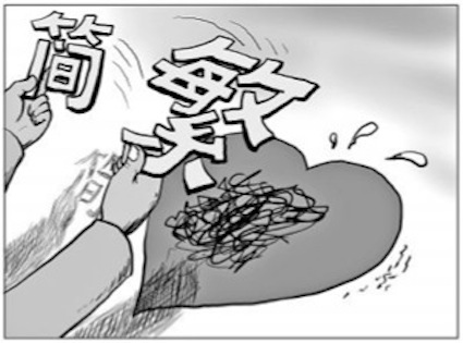 “親不见,愛无心,產不生,厰空空,麵无麦,運无车,導无道,兒无首,飛单翼,湧无力,有雲无雨,開関无门,鄉里无郎……”这是一段在网上流传的文字,言外之意就是简体字隔断历史文化。