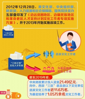 编者按:2020年是打赢脱贫攻坚战、全面建成小康社会的决胜之年。文化扶贫工作作为脱贫攻坚战略部署的重要组成部分,是推动脱贫攻坚工作的精神动力,在决胜阶段发挥着越来越重要的作用。在中共中央组织部等有关部门的指导支持下,文化和旅游部与各地文化和旅游行政部门协同配合、共同努力,“三区计划”人才支持计划文化工作者专项(简称“‘三区计划’文化工作者专项”)以文化人、以文育人的社会效益和文化扶贫的切实成效逐步显现。近日,本报组织记者赴多地采访,各地文化和旅游厅局人事处负责人和当地群众针对该项目实施过程中遇到的普遍性难题,提出了应对建议,分享了经验,展现了项目为各地群众带来的极大获得感。