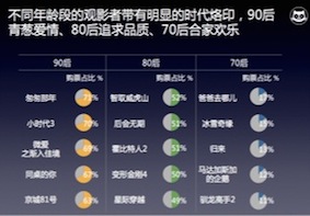 在本次猫眼大数据报告中的一些研究结论颇值得研究,其中包括,1、90后成为观影主力。根据报告,90后购票最频繁达到6.2次,超越80后成为观影主力。2、女生是观影主力。报告显示,猫眼女性用户占比过半,其中90后女生占比近60%。3、三、四线城市增速迅猛。根据报告,中国的一、二线城市牢牢占据过半票房,但三、四线城市增速更为迅猛。除此之外,不同年龄段观影者带有明显的观影偏好,90后偏爱青葱爱情、80后更追求品质、70后偏爱合家欢;地域偏好上,北方更偏好国产片,而南方更喜欢好莱坞电影等。