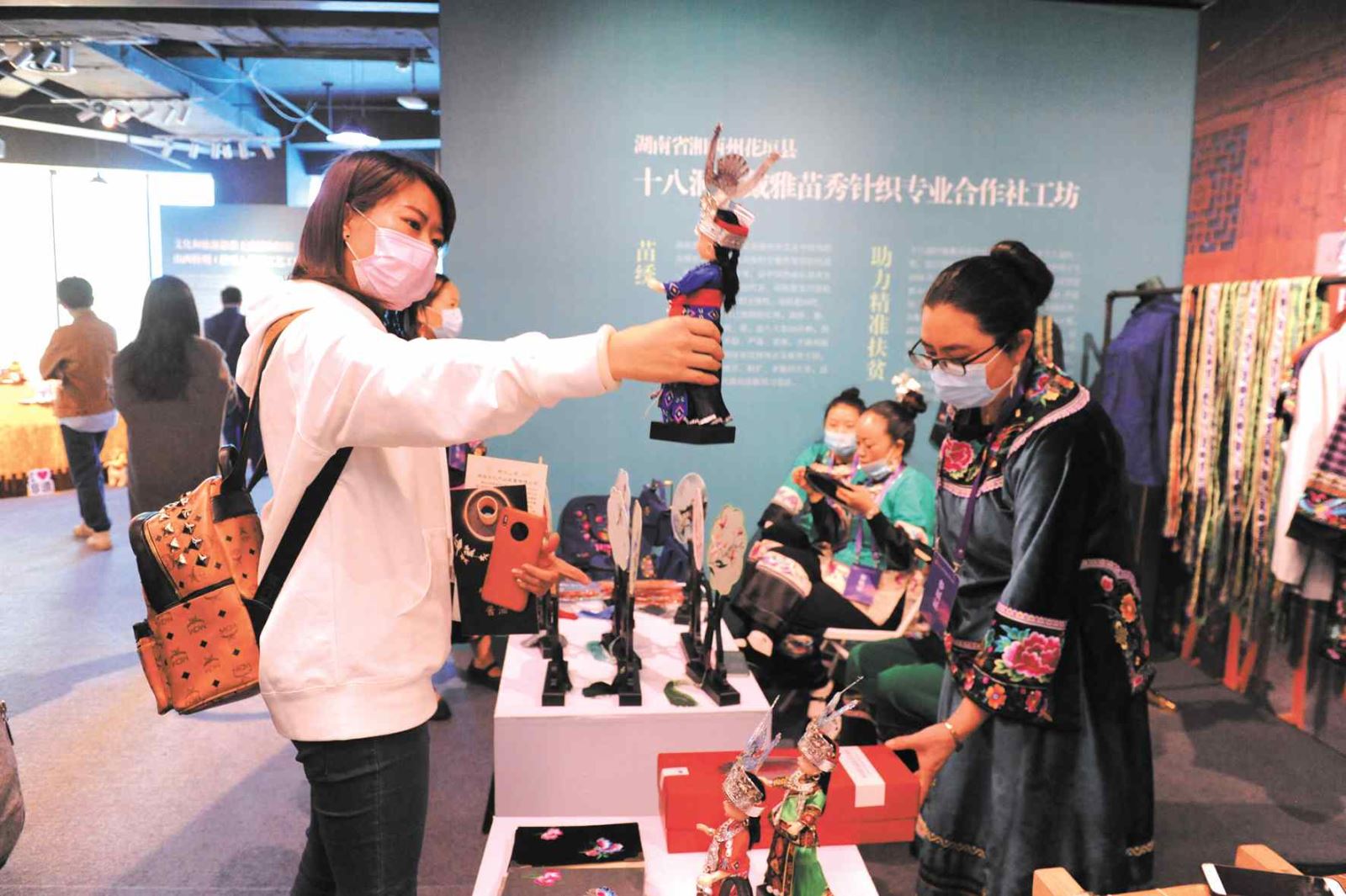 在湖南省花垣县十八洞村,非遗扶贫就业工坊还广泛吸纳了青年力量。28岁的戴雅苗绣针织专业合作社工坊扶贫带头人龙艳芳介绍,苗绣富有深厚历史文化底蕴,是“可盐可甜”、连接古今的一种非遗技艺。在她的带动下,一批年轻人加入工坊,有的负责联系苗绣单子,有的一有空就学习绣法,还有的出创意、出点子,工坊也因新鲜血液注入而更具活力。在龙艳芳面前,剖丝苗绣团扇等制品赢得观众连连称赞。“工艺这么精美的物件应该让更多人知道,我带几件心仪的产品回去请朋友们同赏。”刚买了一件苗绣制品的观众敏敏兴奋地说。