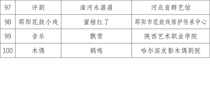 根据《文化和旅游部办公厅关于印发〈“庆祝中国共产党成立100周年舞台艺术精品创作工程”工作方案〉的通知》(办艺发〔2020〕78号),文化和旅游部组织专家,对申报作品进行了认真遴选,选出100部“百年百部”创作计划重点扶持作品、100部“百年百部”传统精品复排计划重点扶持作品、100个“百年百项”小型作品创作计划重点扶持作品,形成了“庆祝中国共产党成立100周年舞台艺术精品创作工程”重点扶持作品名单。现将名单予以公布。