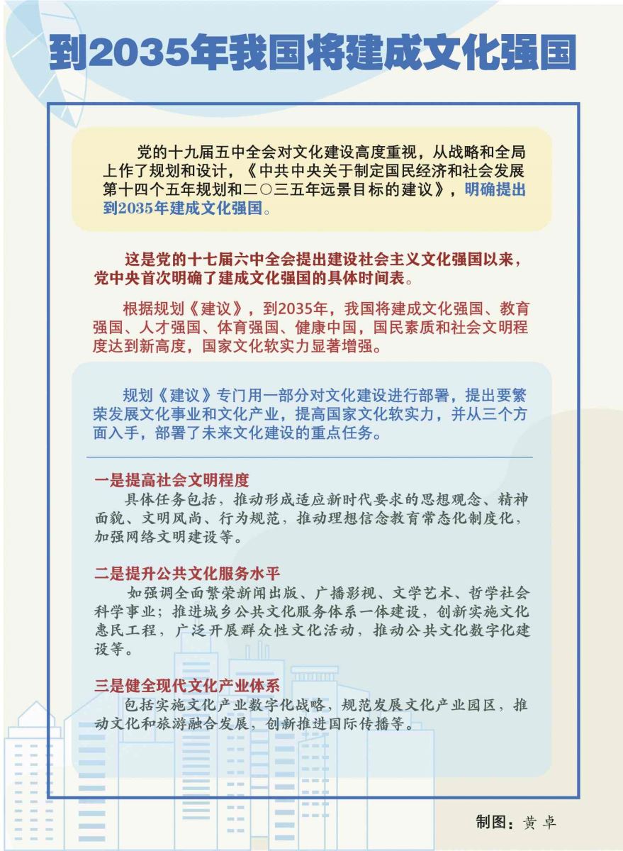 党的十九届五中全会审议通过的《中共中央关于制定国民经济和社会发展第十四个五年规划和二〇三五年远景目标的建议》(以下简称“规划《建议》”),把文化建设摆在突出位置,确立了到2035年建成文化强国的远景目标和“十四五”时期文化建设的主要目标,明确总体思路、部署重点任务,从提高社会文明程度、提升公共文化服务水平、健全现代文化产业体系三个方面对文化和旅游工作进行了全面部署。