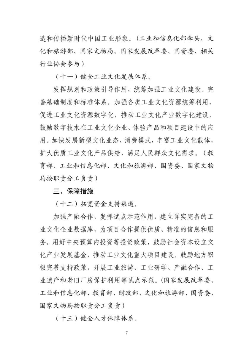 第三部分“保障措施”,重点从拓宽资金支持渠道、健全人才保障体系、发挥中介机构作用等方面,针对工业文化建设亟待解决的资金、人才短缺等问题,加强政策支持,特别注重调动社会力量参与工业文化建设,营造共商共建共享的良好氛围。