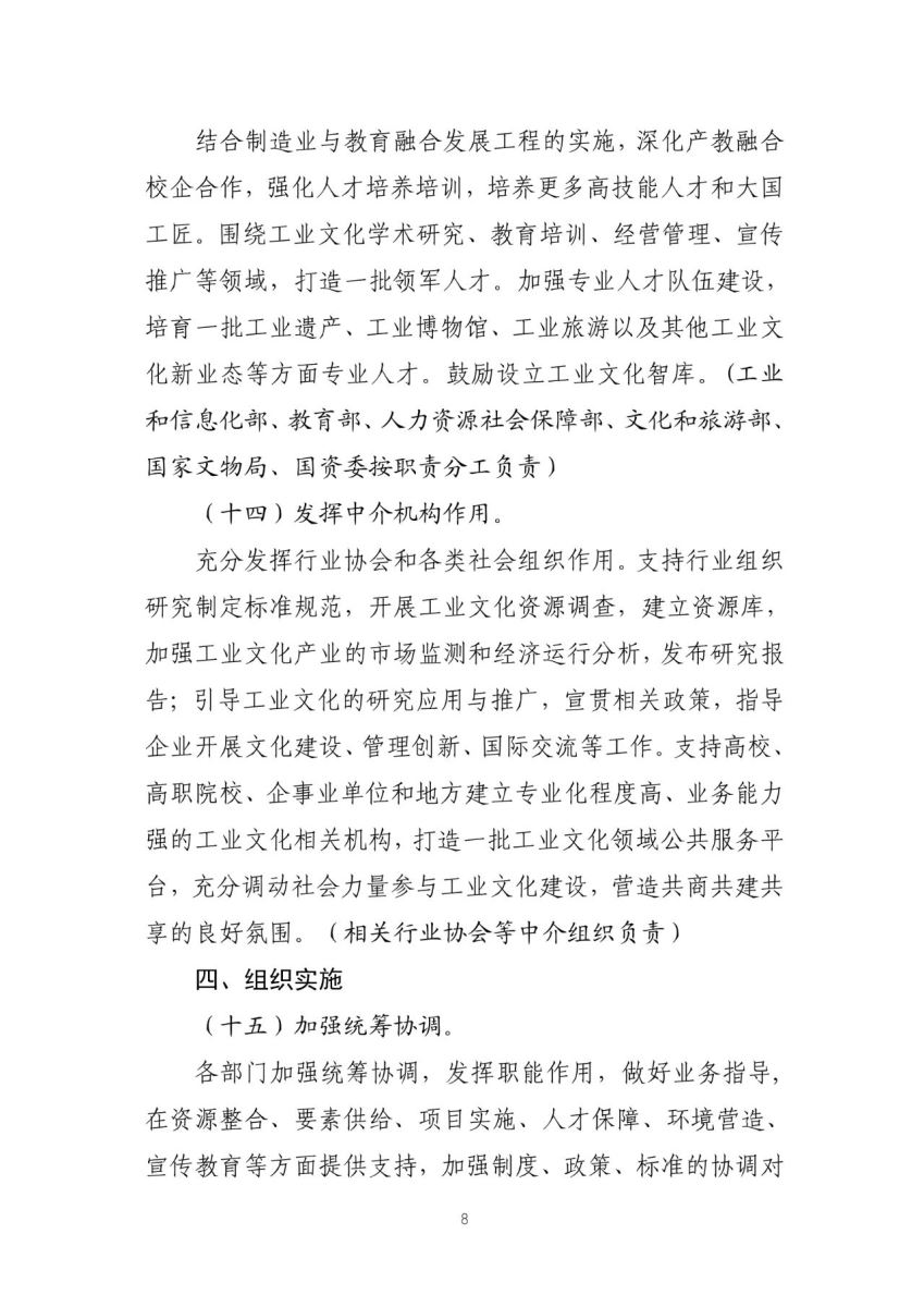 六是加强人才培养。人才在工业文化建设中起到决定性作用,《实施方案》明确要重点培养高技能人才和大国工匠,工业文化学术研究、教育培训、经营管理、宣传推广等领域领军人才,工业遗产、工业博物馆、工业旅游等方面专业人才三类人才,强化人才支撑。