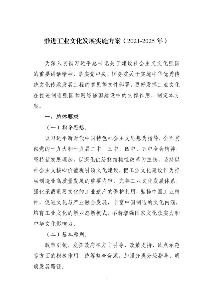 第一部分“总体要求”,提出推进工业文化发展的指导思想、基本原则和主要目标,强调坚持“政策引领、需求导向、协同推进、融合发展”。