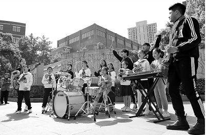 在上海总工会旧址——湖州会馆旁的纪念公园内,中建二局华东公司的青年建设者和受邀前来的小学生们在活动中演唱红色歌曲。新华社发