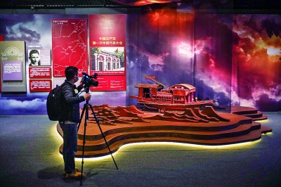 3月9日,参观者在北京首都博物馆展厅内拍摄浙江嘉兴南湖红船模型。新华社发