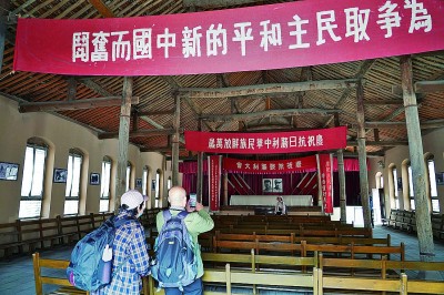 游客在陕西延安王家坪革命旧址内参观中共中央军委礼堂。新华社发
